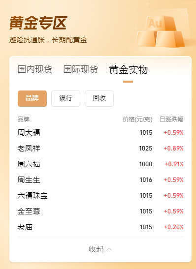 截至中午12时许,周大福金饰报价1015元/克,单日上涨0.59%;老凤祥金饰报价1025元/克,单日上涨0.89%;周六福金饰报价1000元/克,单日上涨0.91%;老庙黄金金饰报价1015元/克,单日上涨0.2%。