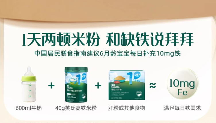 那么米粉每天应该吃多少?前面说到6月龄左右的宝宝每天吃够奶后还有608-808kJ的能量缺口,经科学计算,约65g英氏配方米粉(即两顿的量)可提供约808kJ的能量,恰好补足能量缺口。在营养方面,600mL配方奶+65g英氏配方米粉的组合可提供约9.2mg的铁,基本满足宝宝每日铁需求。所以,6-12月龄的宝宝每天要吃两顿米粉,上午一顿托住白天的探索,下午一顿守护夜晚的安稳。规律两顿,宝宝成长更稳,家长也更从容。