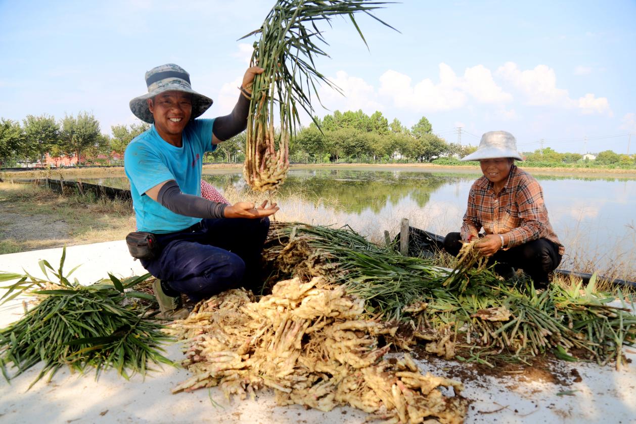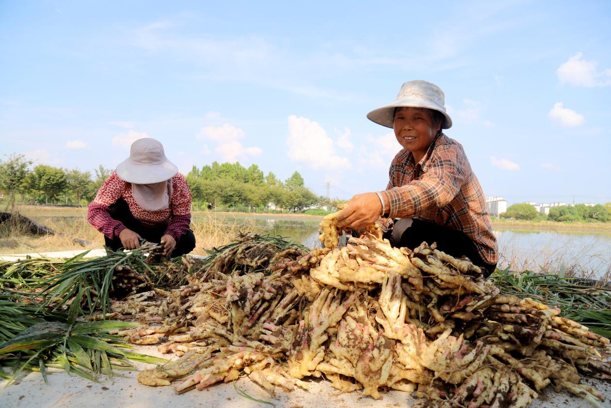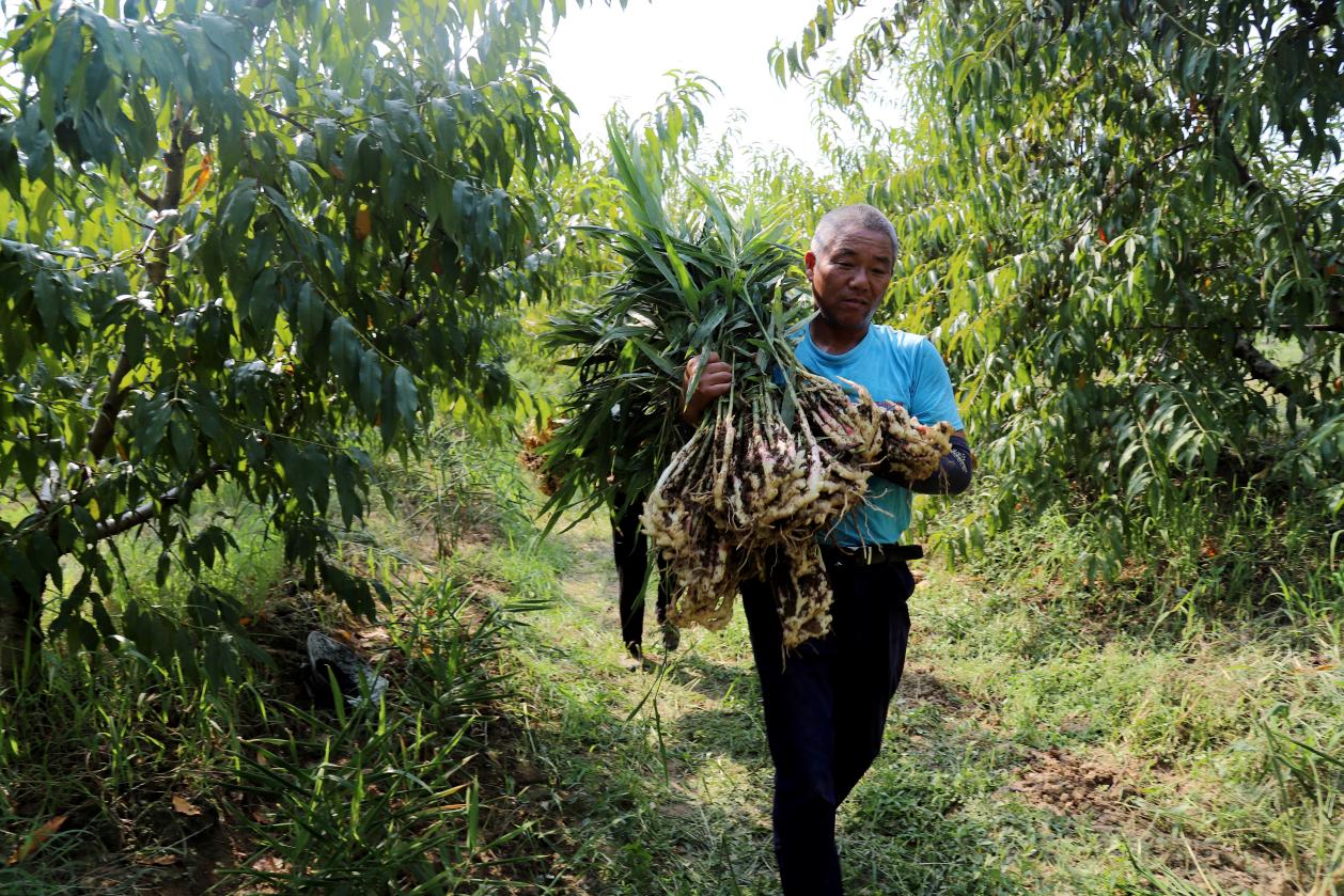 9月3日,高淳区桠溪街道康鸿家庭农场桃园里,工人们正在桃树下收获白姜。据悉,康鸿家庭农场在发展黄桃经济的同时,通过树下种植铜陵白姜拓宽增收渠道。目前,该农场种植的白姜进入收获期,平均亩产量800公斤左右。