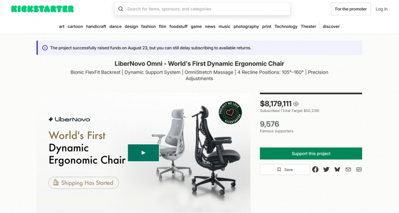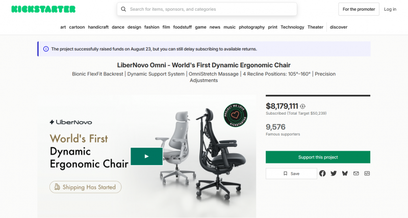 近日,深圳品牌 LiberNovo(清闲智能)推出的全球首款动态人机工学椅 Omni 在海外市场引发了轰动。自 6 月 24 日登陆 Kickstarter 众筹平台以来,该产品迅速吸引了全球消费者的目光,上线 24 小时内,众筹金额即突破约 675 万人民币。截至目前,众筹金额已突破 800 万美金(约合 5700 万人民币),斩获近万名用户支持,成为 2025年Kickstarter 平台近期现象级项目。