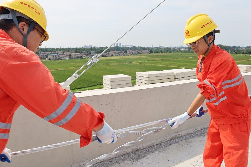 接触网附加导线架设是接触网专业施工的重要环节。沪渝蓉高铁沪宁段正线全长351公里,共需架设附加导线756.317条公里。为确保首条附加导线顺利架设,中铁电气化局沪渝蓉高铁沪宁段强电项目部提前编制专项施工方案,组织安全技术交底及岗位练兵,并开展全方位的协调工作,严格把控工程建设的安全与质量。本次架设的附加线,架设总长1952米。在作业过程中,作业人员起锚、展放、紧线、落锚等工序无缝衔接,精确控制附加线张力在15KN范围内,确保附加线张力达到要求,实现了“首件即样板”的目标。