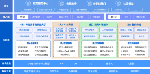 AI公务员基于数字人技术,可承担咨询解答、政策宣讲、跨部门事项协同经办等多重角色;政务AI智能体则作为智慧政务服务中枢,具备强大的AI感知、决策和执行能力;智能终端设备则成为连接线上线下的重要桥梁。