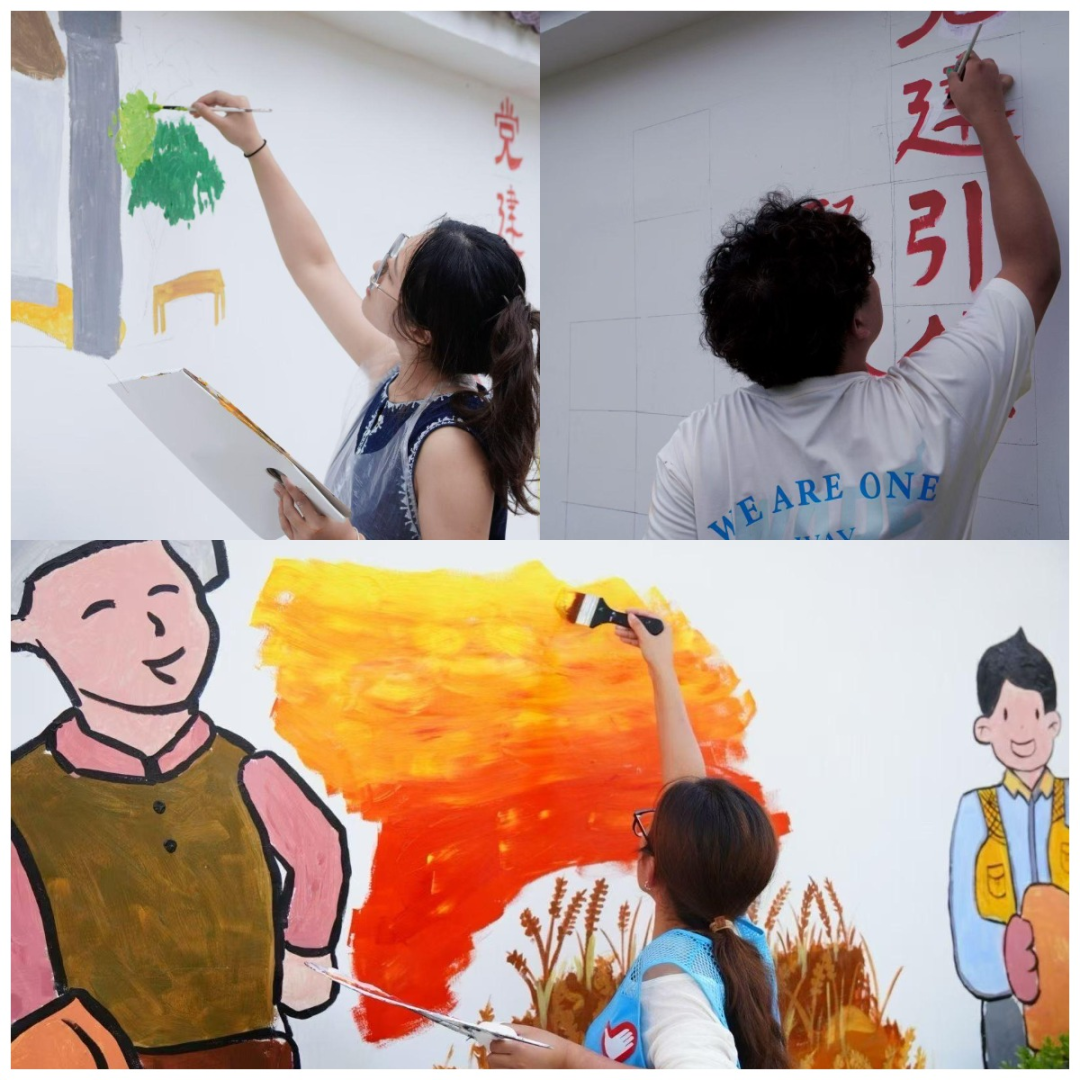 活动中,队员们分工协作,有人专注勾勒轮廓,有人细致调配色彩,有人耐心填充图案……从金黄的丰收麦田、生动的农家劳作场景,到富有时代气息的标语,一幅幅色彩鲜亮、充满活力的墙绘在墙面逐渐成型,为原本朴素的乡村墙体注入艺术气息与时代活力。