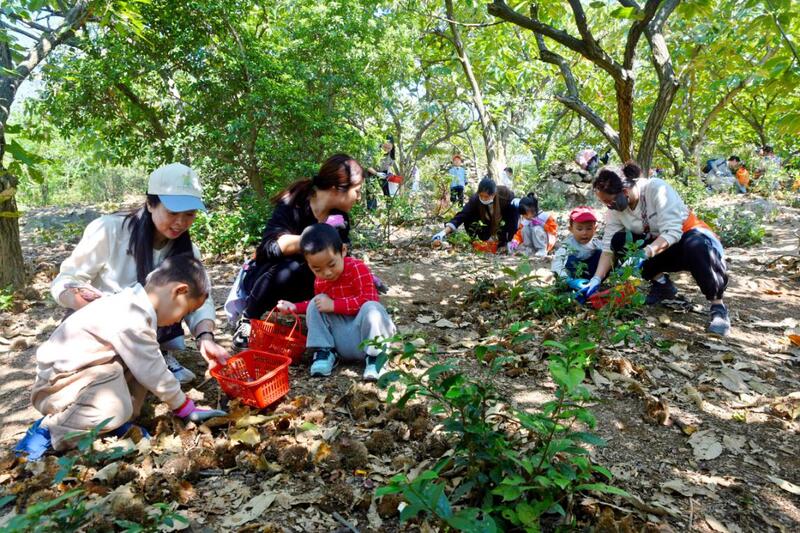 “平时在城里很少能接触到农作物,这次带孩子来亲手采摘板栗,不仅让他认识了板栗的生长过程,还体验到了劳动的快乐,感觉特别有意义。”来自南京市玄武区的游客王女士一边展示刚采摘的板栗,一边笑着说。“自从我们度假区推出了板栗采摘游后,游客较平时多了好几倍。”晶桥镇竹上云想度假区负责人邰锡凤介绍,板栗九月中旬成熟后,度假区推出了“板栗采摘游”项目,除了现场采摘,园内还设置了板栗美食体验区,糖炒板栗、板栗炖鸡、板栗糕等特色美食轮番登场,刚出锅的糖炒板栗热气腾腾,甜香四溢,成为游客争相品尝的“秋日限定”。