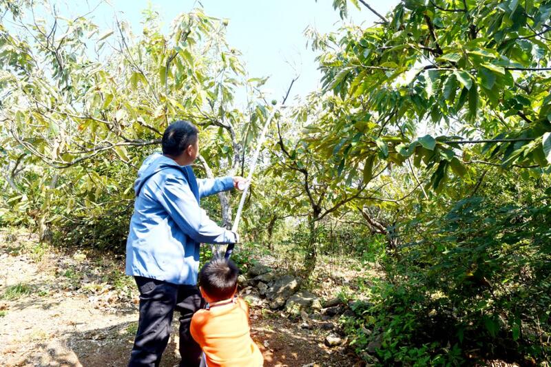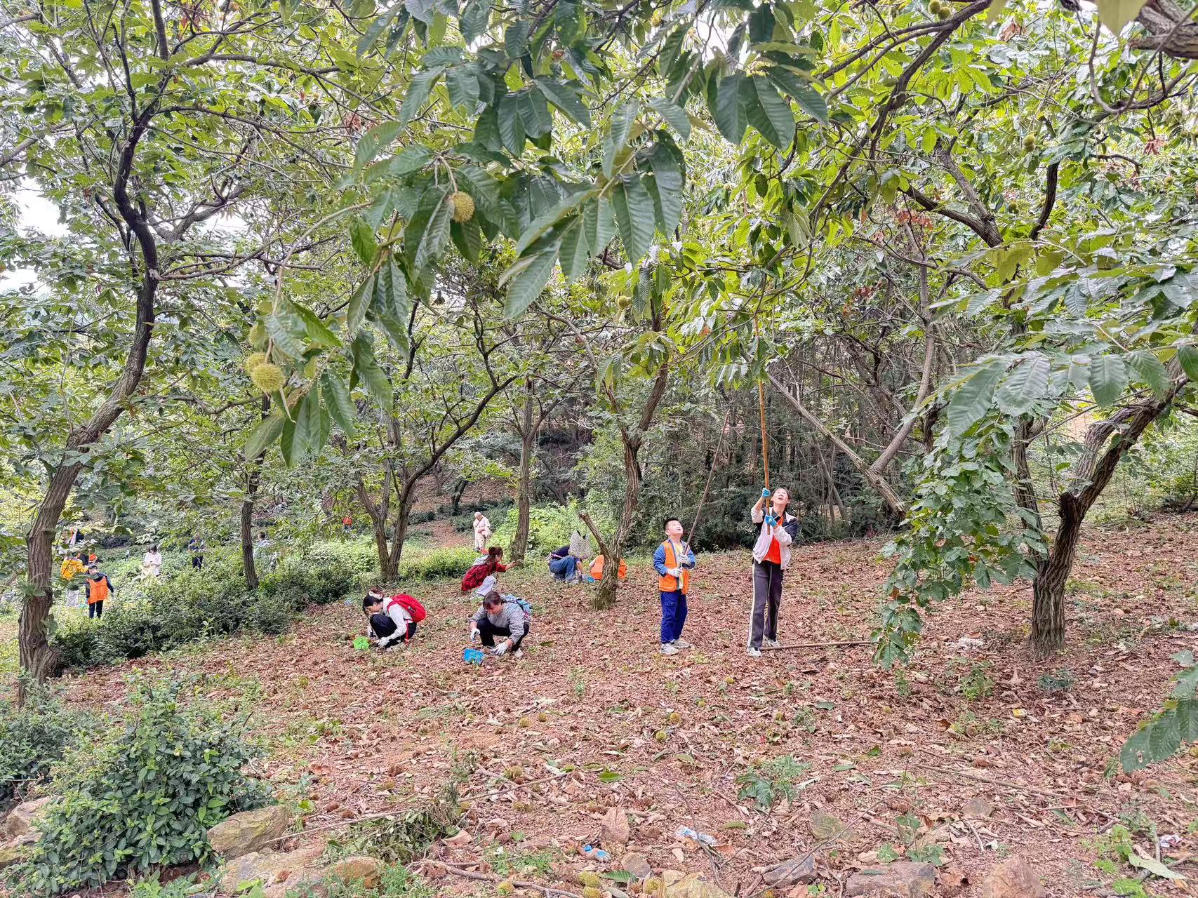 9月21日,记者走进晶桥镇竹上云想度假区的百亩板栗园,茂密的板栗树枝叶间,长满尖刺的板栗球像一个个小刺猬挂在枝头,微风拂过,不时有成熟的板栗球掉落。游客们头戴草帽,手持竹竿,在果农的指导下小心翼翼地敲打树枝,“噼啪”声中,一个个板栗球应声落地。孩子们则兴奋地穿梭在树下,捡拾掉落的板栗球,时不时用脚轻轻一踩,外壳裂开,露出棕褐色的板栗果,欢声笑语回荡在整个果园。