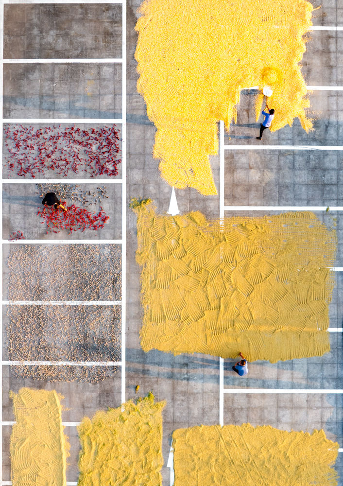 ↑2025年9月7日,农民在重庆市南川区黎香湖镇西湖村晾晒稻谷、玉米、花生、红辣椒等农作物。(无人机照片)CICPHOTO/罗川 摄