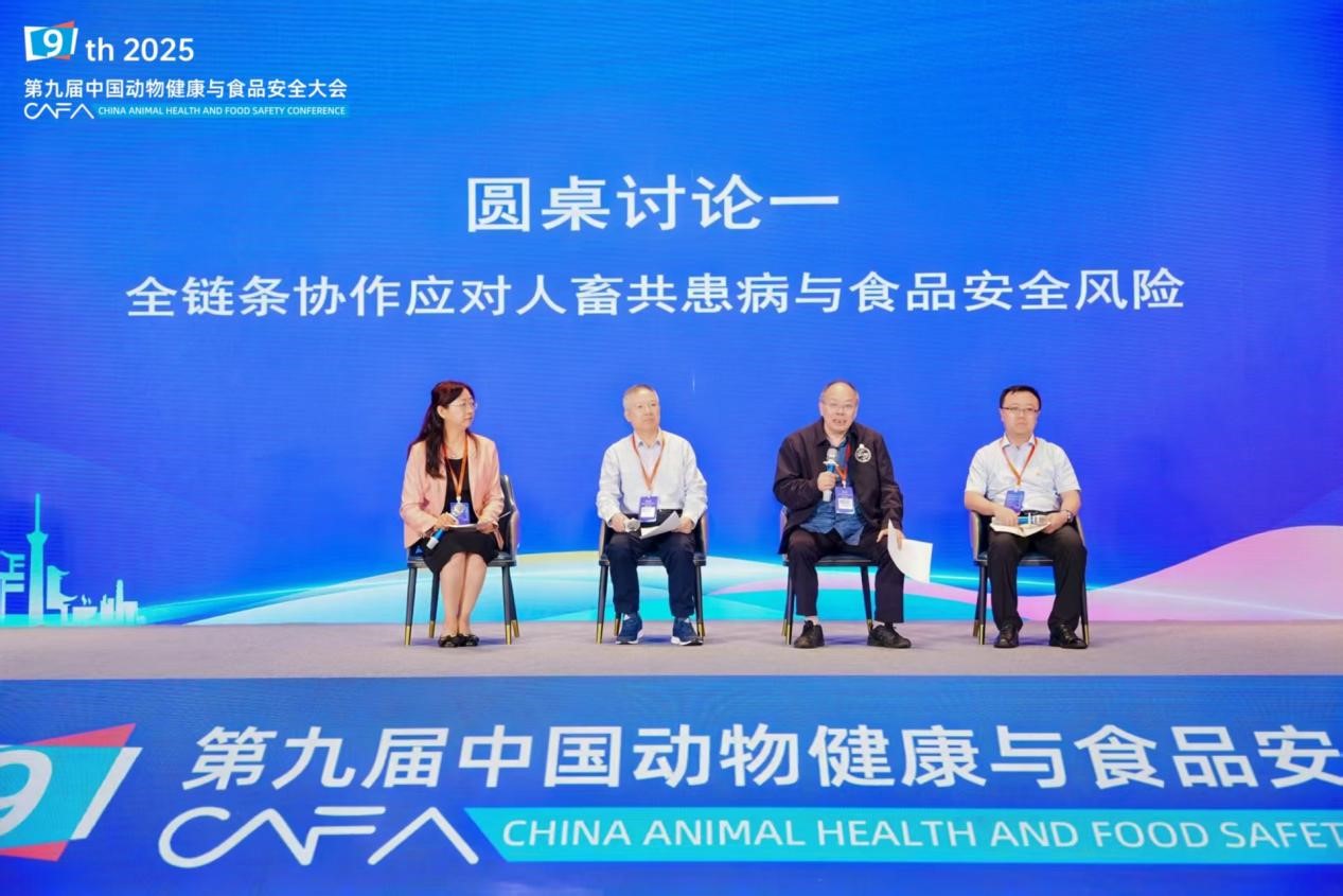 国家食品安全风险评估中心技术总师吴永宁、中国兽药协会秘书长董义春、中国牧工商集团副总兽医师齐岩,围绕全链条协作应对人畜共患病与食品安全风险主题展开讨论。四川大学生命科学学院教授王红宁主持了本场圆桌讨论。
