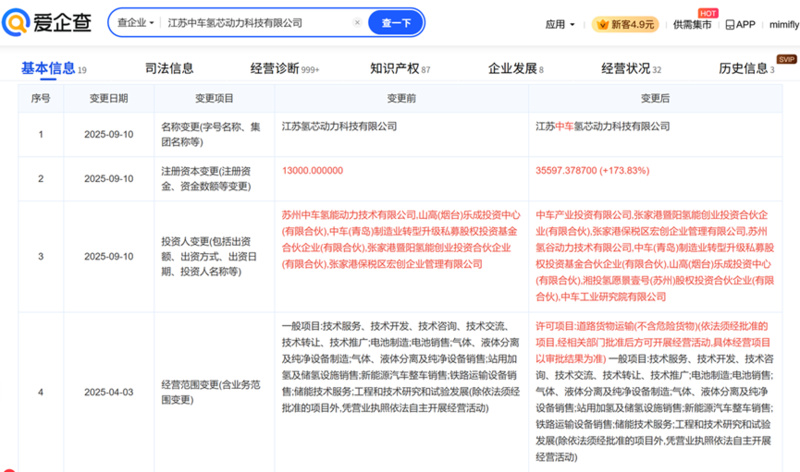 新华日报财经讯 9月10日,位于苏州张家港的“氢芯动力”正式更名为“中车氢芯”,并获得新一轮融资,由中车产业投资有限公司领投,中国中车和湘投集团跟投,注册资本增加173.83%,经营范围增加“道路货物运输”。