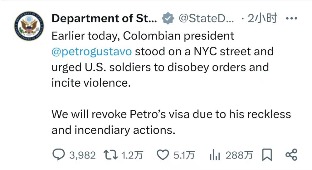 当地时间26日晚10时许(北京时间27日10时许),美国国务院在社交媒体上发表简短帖文称,当天早些时候,佩特罗站在纽约街头,“敦促美国士兵不服从命令并煽动暴力”。
