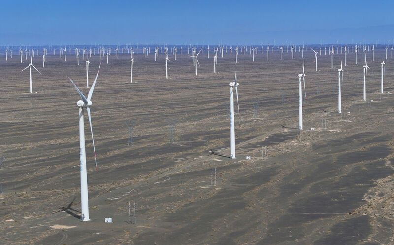 在新疆哈密地区巴里坤哈萨克自治县拍摄的三塘湖风电场(4月27日摄,无人机照片)。