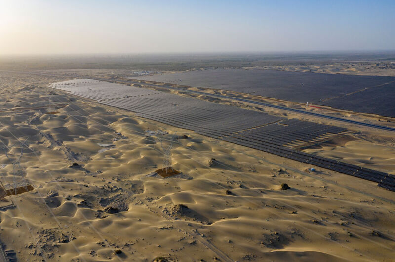 9月22日在新疆巴音郭楞蒙古自治州若羌县拍摄的中国绿发新疆中绿电若羌400万千瓦光伏项目(无人机照片)。
