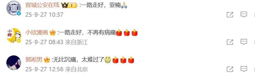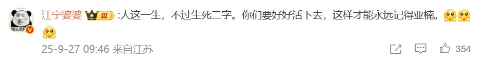 众人在评论区纷纷悼念,“江宁婆婆”称:“人这一生,不过生死二字。你们要好好活下去,这样才能永远记得亚楠。”