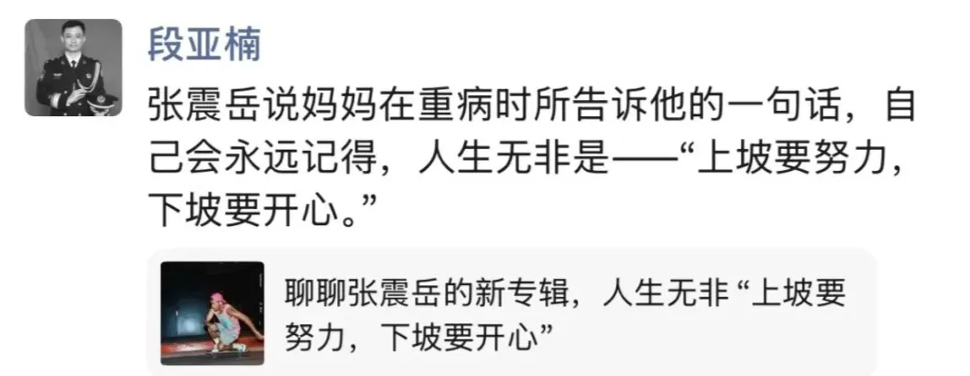 9月20日,他在朋友圈发出一段话:张震岳说妈妈在重病时所告诉他的一句话,自己会永远记得,人生无非是——“上坡要努力,下坡要开心。”