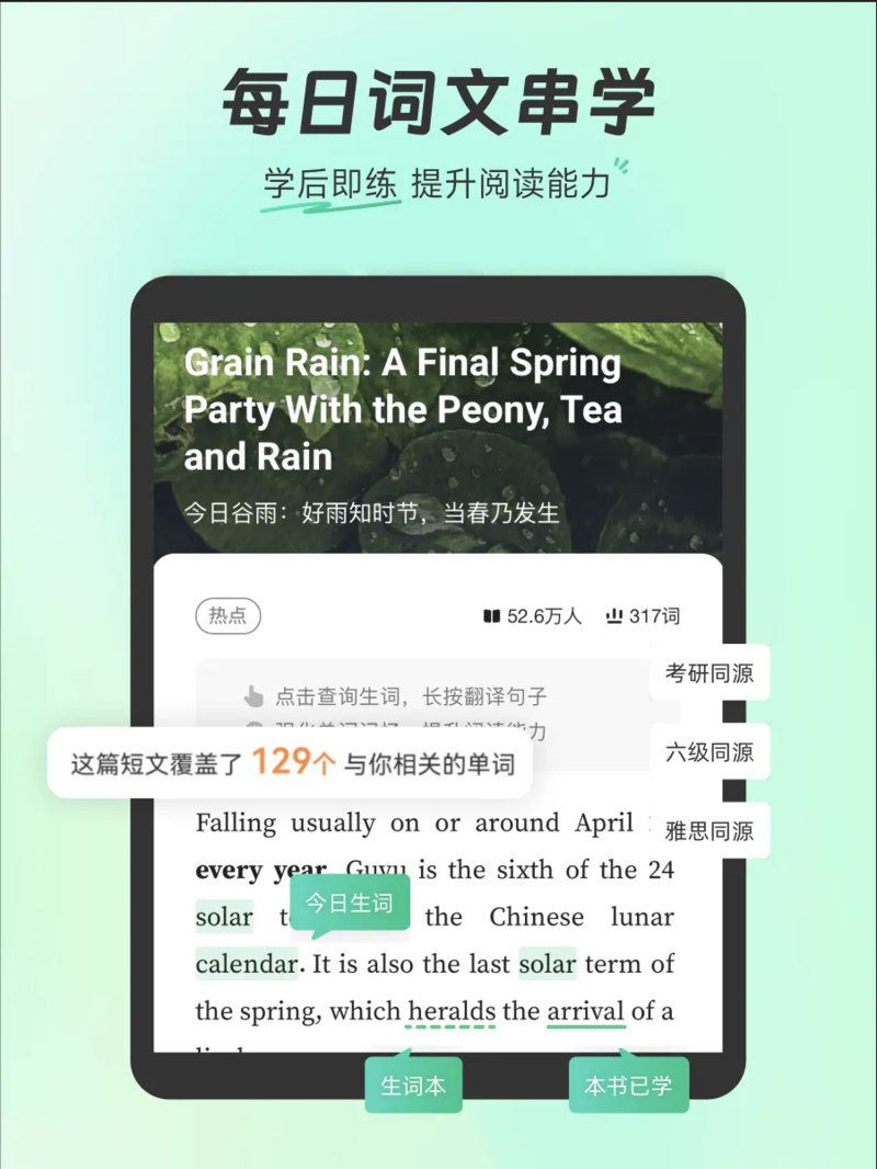 • 从考研、四六级、雅思考试同源外刊中匹配优质短文;