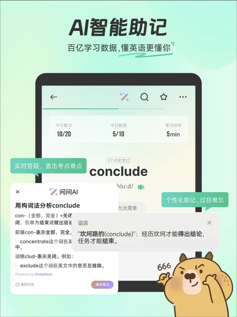 • AI专属助记:扇贝AI智能监测学习情况,如果你反复记不住某个词,它会触发谐音梗、构词法等花式助记!比如:“ambulance(救护车)→ 谐音‘俺不能死’,需要ambulance!” ……超99%用户表示扇贝AI及时助记,帮自己神奇攻克了难记词,并且记得牢牢的。