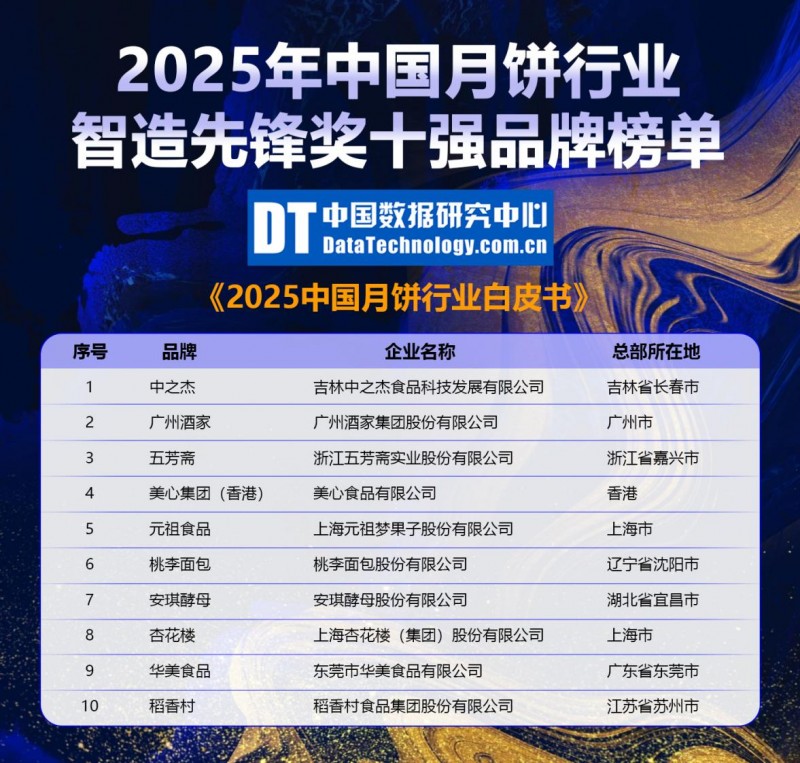 2025年中国月饼行业智造先锋奖十强品牌榜单,包括中之杰、广州酒家、五芳斋、美心集团、元祖食品、桃李、安琪酵母、杏花楼、华美食品、稻香村。
