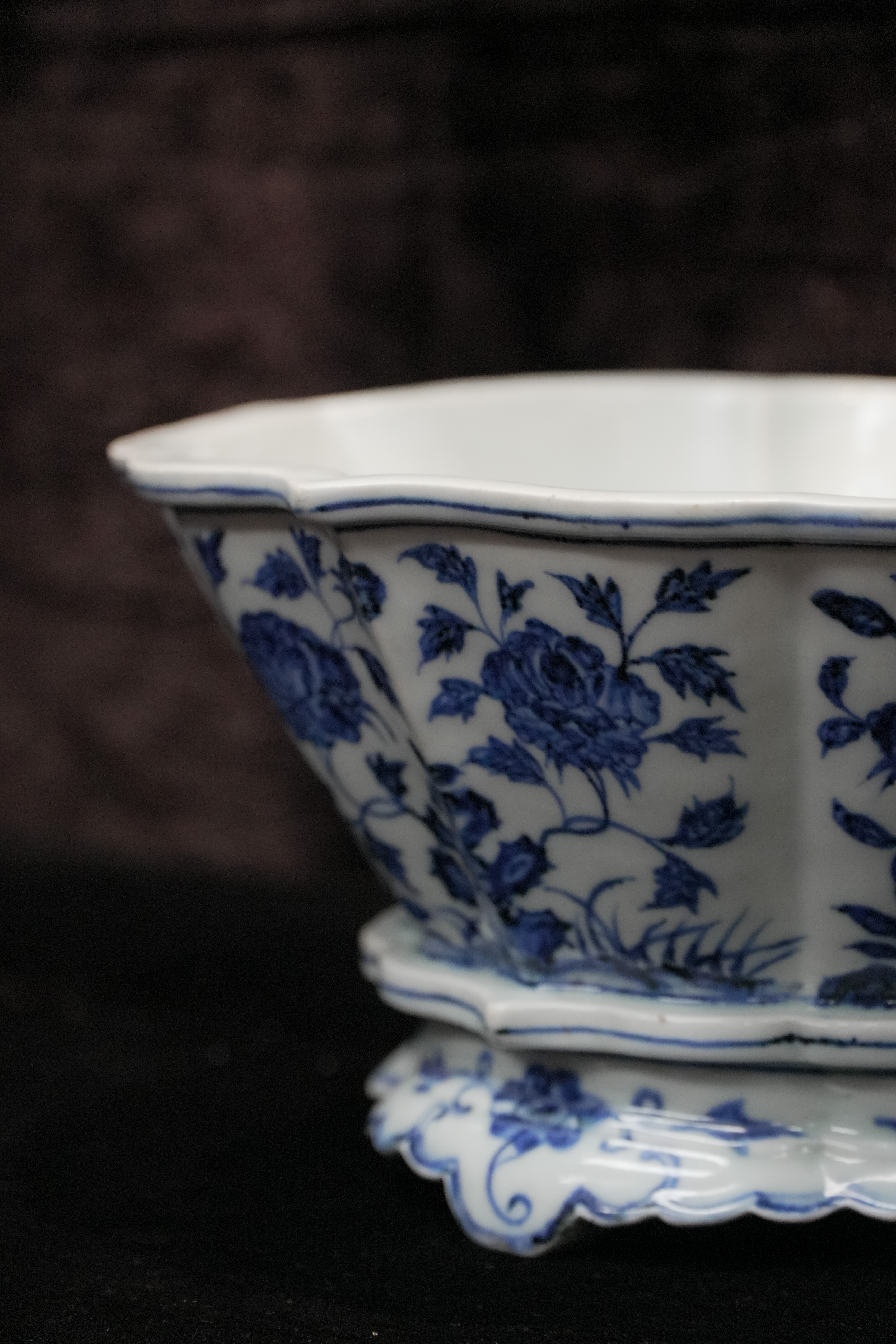 在此次展览中,明永乐青花花卉纹菱口花盆作为明代瓷器巅峰水准的典型代表,也为观众揭开了中国瓷器与时代气韵之间的深层关联。远远望去,花盆就像是四瓣海棠花,巧妙借鉴了波斯金银器的风格,尽显异域风情;釉面厚润如脂,青花发色尤为惊艳,采用进口的“苏麻泥青”料绘制而成。有意思的是,永乐、宣德年间恰是郑和下西洋的重要时期。这件花盆的进口青花料、融合异域元素的造型,恰好成为当时对外贸易繁荣、文化交流频繁的生动见证。