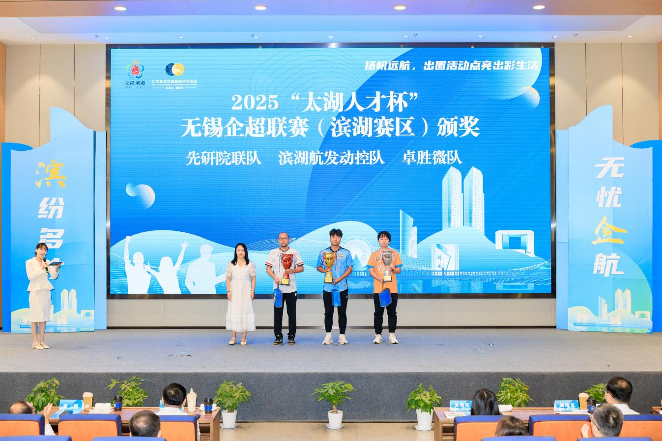 现场为航发动控、卓胜微、先研院联队等获奖队伍颁发2025“太湖人才杯”无锡企超联赛(滨湖赛区)奖项,让人才以球会友实现跨界交流,激发团队凝聚力和向心力,将赛事“流量”转化为人才“留量”。