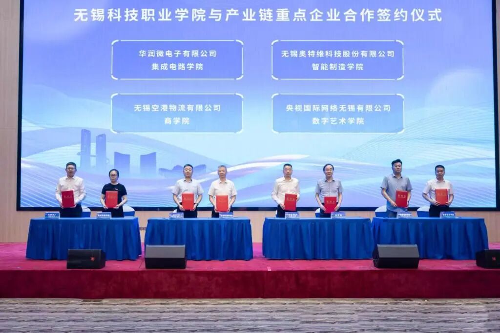 仪式上,无锡科技职业学院集成电路学院、智能制造学院、商学院、数字艺术学院分别与华润微电子有限公司、无锡奥特维科技股份有限公司、无锡空港物流有限公司、央视国际网络无锡有限公司等4家产业链重点企业签署合作协议,实现企业需求对接更精准,学校培训服务更精细,推动校企双方在人才培养和企业员工技能提升等方面双向赋能、互促共进,精准服务区域产业高质量发展。