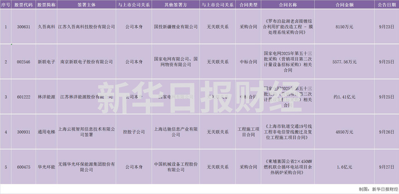 9月23日,江苏久吾高科技股份有限公司发布公告,与国投新疆锂业有限公司正式签署《罗布泊盐湖老卤提锂综合利用扩能改造工程-膜处理系统采购合同》,合同总价8150万元(含13%增值税)。项目内容包括膜处理系统全部设备制造、采购、指导安装及调试、技术培训与验收等。公司表示,本合同采用分阶段付款方式,项目顺利实施后将进一步巩固公司在盐湖提锂领域的市场地位。本合同金额占公司2024年度经审计营业收入的15.28%。