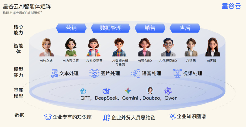 星谷云是一款集营销、销售、SCRM为一体的一站式出海AI营销智能体矩阵平台。 由AI独立站、AI内容及运营、AI数据分析与投流、AI销售、AI客服等六大核心AI智能体组成。 打造B2B企业专属的“虚拟组织”和人机协同机制,构建从获客、品牌和渠道建设到成交的全链路营销体系,助力企业智能出海。 依托多模态AI技术和第一方数据,协同Google、Facebook、TikTok、Linkedin等全球媒体巨头,为企业提供专属的出海营销方案。