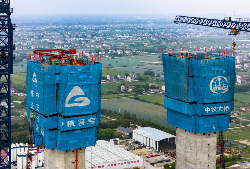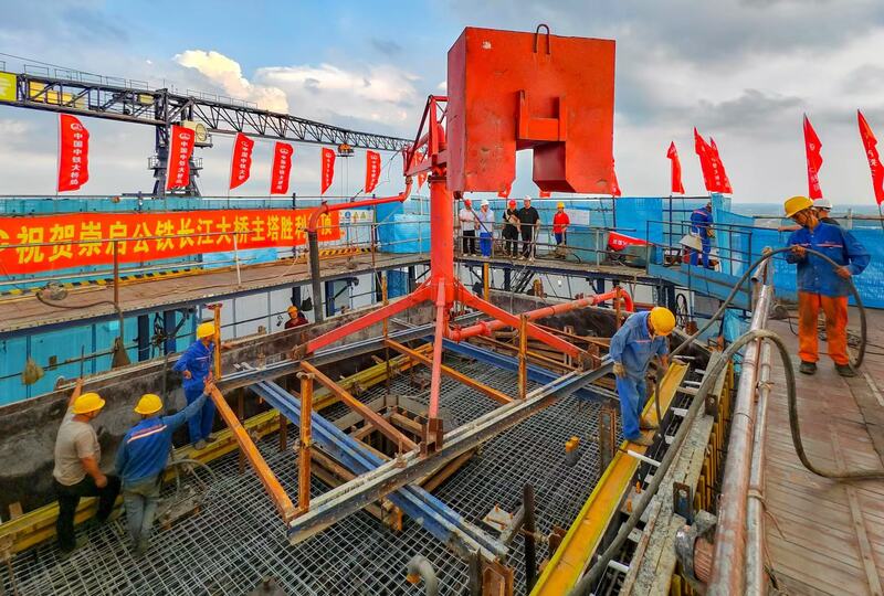 交汇点讯 9月29日,在万里长江入海口,随着最后一方混凝土从崇启公铁长江大桥3号与4号主塔施工平台同时泵送,浇筑至153米高的塔顶,在建世界最大跨度公铁两用无砟轨道斜拉桥双主塔同日封顶。大桥由此转入斜拉索挂索施工新阶段,为大桥主桥钢梁合龙奠定了坚实基础。