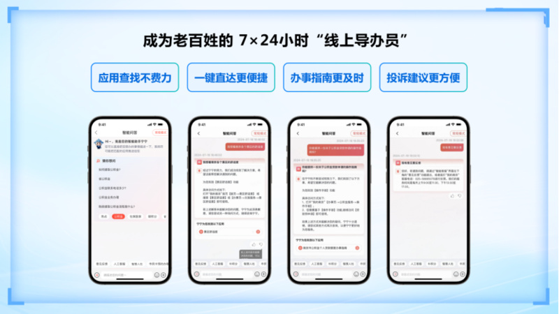 目前,已经上线的政和紫金大模型,实现对“我的南京”App线上服务事项的100%覆盖,并且实现推荐准确率超90%。这个“智慧大脑”,通过以政务为主的行业领域大模型,为用户提供业务咨询问答、智能应用推荐等服务;通过智能化处理和数据分析,大幅提高政务服务的响应速度和处理效率,提供更加人性化和便捷的交互体验,处理更复杂的用户问题,提供更全面的服务支持。