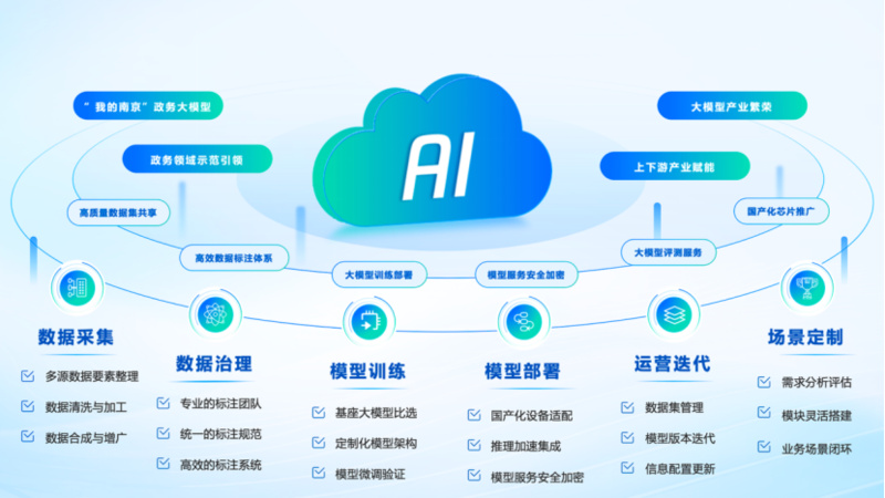 在人工智能迅速发展的趋势下,“我的南京”政务大模型融合项目,将政务服务场景与大模型的先进能力进行深度融合,依托“我的南京”App,搭建含应用层、引擎层、模型层、数据层、设施层于一体的系统架构,深挖数据要素价值,建设高质量语料库和政务数据集,支撑人工智能大模型开发与训练,实施内容包括数据治理、数据标注、大模型训练部署、应用智能推荐、安全风控等多个功能板块。