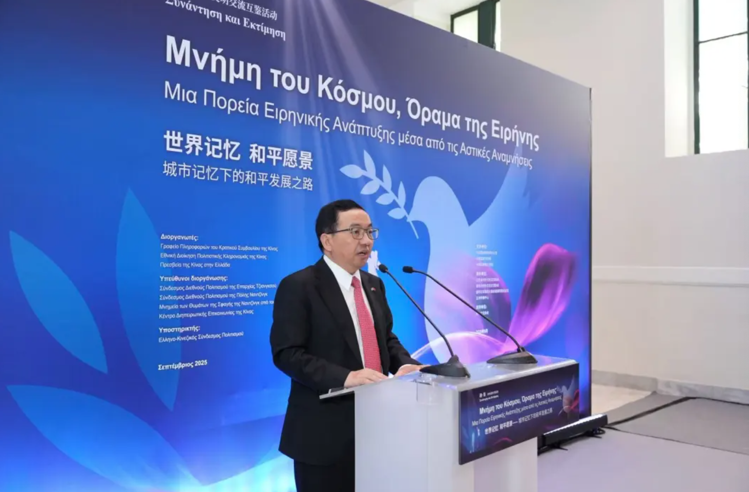 中国驻希腊大使方遒在致辞中表示:“此次展览不仅是南京与雅典两座城市的交流互动,更是中希两大古老文明跨越山海的深情对话。我们愿同希方一道,坚持弘扬正确二战史观,坚定维护二战胜利成果,让推进全球治理体系变革、推动构建人类命运共同体的成果,更多更好造福全人类。”