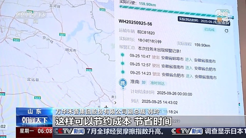 万华禾香集团股份有限公司副总裁 韩玲:对于固定的线路,我们有大量的数据支撑之后,方便我们的司机对整个运输的线路做一个最佳路径的选择,这样可以节约成本,节省时间。