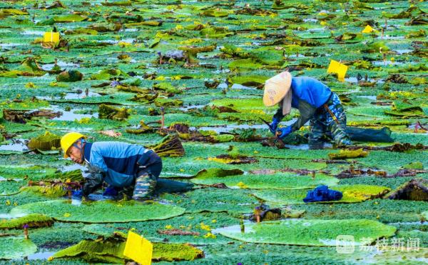 我们也跃跃欲试,换上水裤就往塘边凑,谁知脚下一滑,险些摔进塘里,多亏一旁的卢田师傅伸手扶了一把。好不容易稳住脚踩进塘里,跟着他在淤泥里慢慢挪步,学着用竹刀划开面前的叶片,掀开浮在水面的绿盘,再把手探进水里,用力拽出藏在底下的芡实果。卢师傅笑着说:“我把地承包出去收租金,采摘季再来帮忙,一天300元,50天能挣15000!”