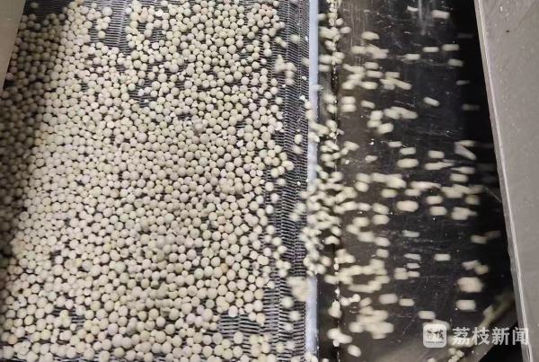 离开芡实田,我们循着机器声走进村里的一座现代化加工厂。车间内,刚脱壳的芡实正沿着传送带“旅行”。它们首先经过超声波循环清洗,高压水流裹挟着气泡,将果仁上的杂质冲洗干净;然后,干净的芡实再被送入液氮速冻隧道进行冷冻保鲜。淮安千润农业科技有限责任公司行政经理林青伟介绍说:“通过液氮速冻,我们能在60秒内实现零下150度左右的瞬时锁鲜,极大地保存了芡实应有的口感和状态,养分不会流失。我们已经和农户签订包产包销的兜底协议,保证芡实产得出也销得好。”