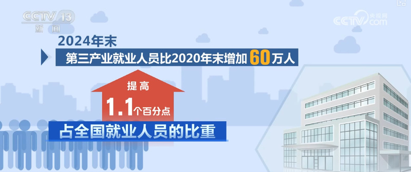 就业形势总体稳定,城镇就业人员继续增长。2024年末,全国城镇调查失业率均值为5.1%,比2020年下降0.5个百分点。第三产业吸纳就业能力增强。2024年末,第三产业就业人员比2020年末增加60万人,占全国就业人员的比重提高1.1个百分点,第三产业就业“蓄水池”作用更加凸显。