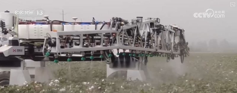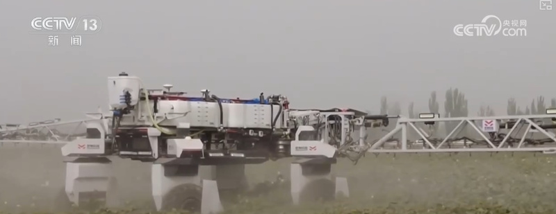 智能喷施机器人展开的“双翼”总长度21米,其实就是超长喷杆,作业时可同时覆盖9行棉花,每分钟作业面积超过3亩。它的轮距和底盘高度可以根据不同行距与株高的棉田进行调节,实现精准化、均匀化的高标准喷施作业,效率比传统脱叶机提升一倍以上。