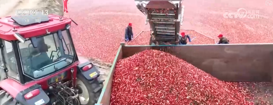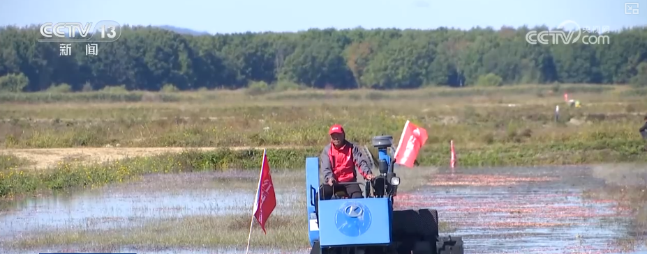 在位于黑龙江抚远市的蔓越莓种植基地,水上打果机的应用让采摘更加高效。工人们先将蔓越莓田里注满水,然后驾驶打果机在水中穿梭作业。机械臂搅动间,一颗颗红色的果实脱离枝蔓漂浮到水面上,工人们利用专业工具将蔓越莓聚拢到一起完成收获。