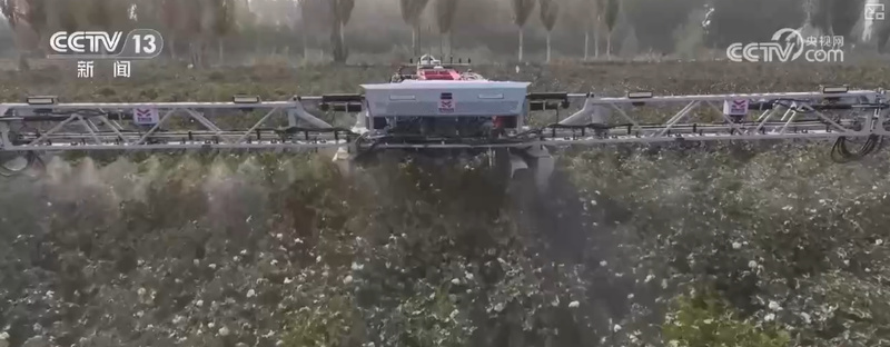在阿拉尔市塔南镇的棉田里,洁白的棉桃开始吐絮,一台犹如展开双翼的智能喷施机器人正在棉田中快速“奔走”,均匀、精准地喷施脱叶剂。