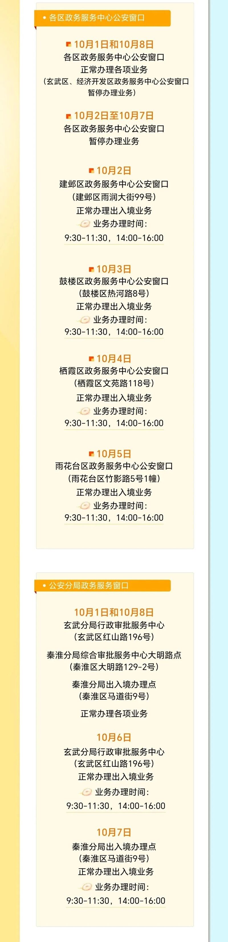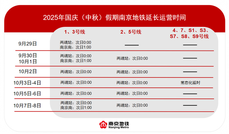 1.假期期间(9月30日至10月8日)地铁1、2、3、5号线延时运营,末班车于次日0:00自两端站发出;另为做好与主要铁路枢纽的客流衔接,9月29日至10月1日、10月7、8日,1、3号线在两端末班车0:00对发的基础上,南京南站的末班车于次日1:00发出,延时期间行车间隔为10—15分钟。