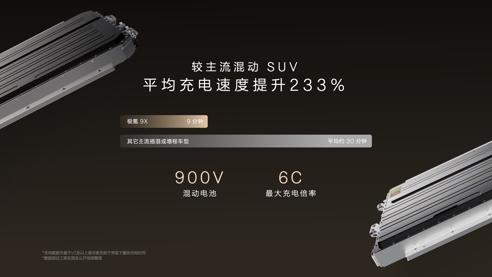 极氪9X全系采用与宁德时代联合开发的900伏混动专用电池,提供两种大电池方案。全球混动领域容量最高的70度大电池,纯电续航里程达到380公里,全球插混产品中纯电续航最高;起步版本也是同级最大55度电池,CLTC纯电续航300公里。两种电池方案均支持6C超快充,从20%充至80%仅需9分钟,领先所有混动产品和99%的纯电车型。