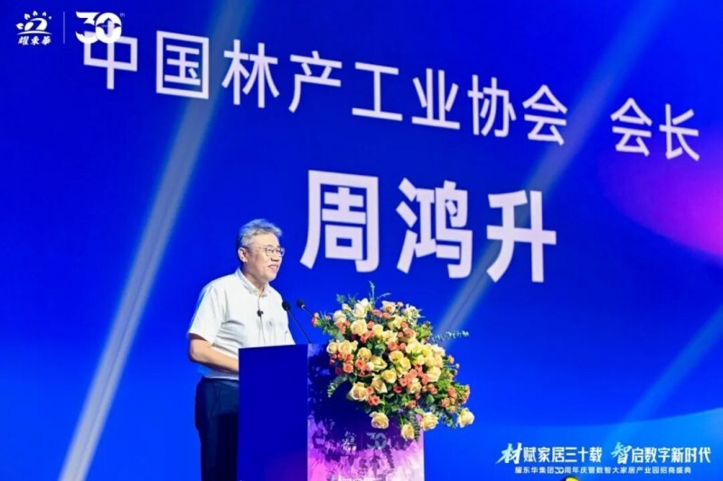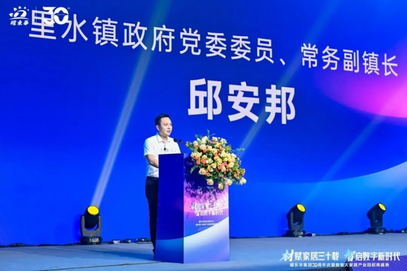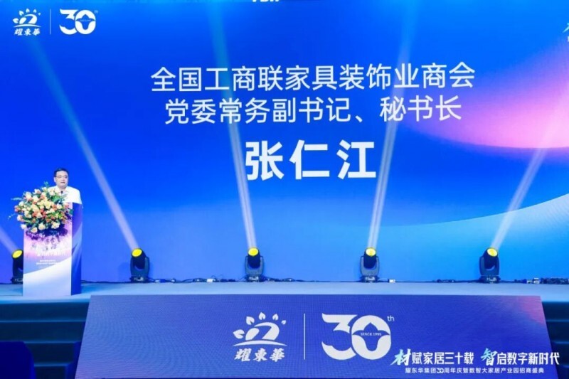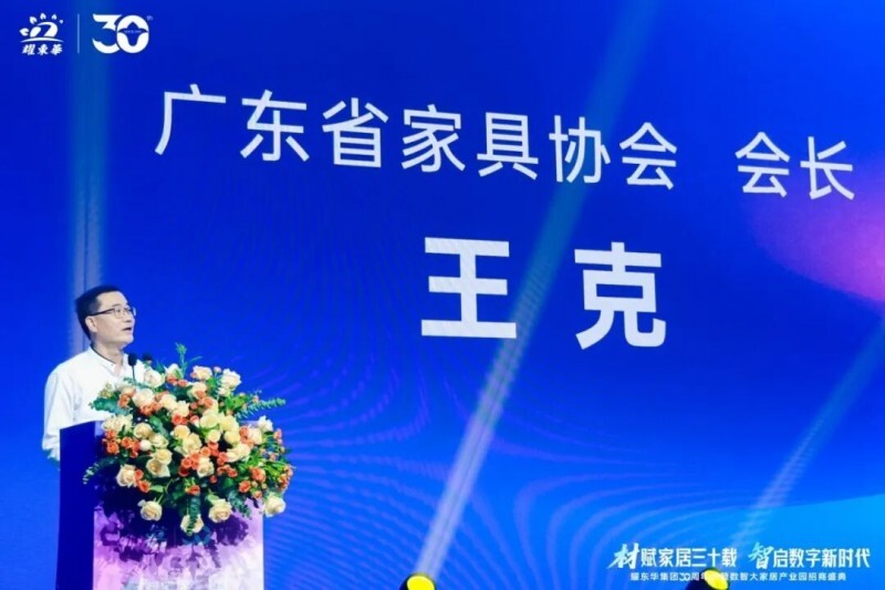 随后,中国林产工业协会会长周鸿升先生、全国工商联家具装饰业商会党委常务副书记、秘书长张仁江先生、广东省家具协会会长王克先生、里水镇政府党委委员、常务副镇长邱安邦先生依次上台,从行业趋势、民营经济活力及地方产业发展等角度,对耀东华三十年来所取得的成就表示高度认可。