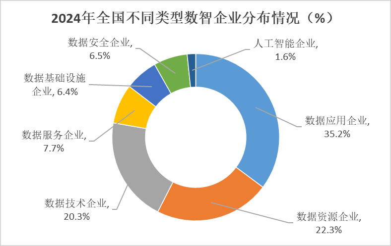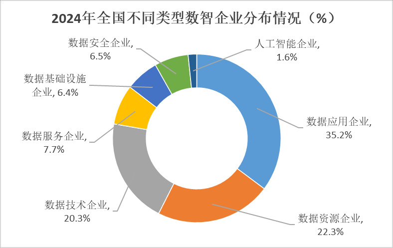 《报告》数据显示,2024年我国数智企业数量达到410467家。其中超过1/3是数据应用企业,数量多达144500家;数据资源、数据技术、数据服务、数据安全、数据基础设施、人工智能企业的数量分别为91432家、83256家、31435家、26789家、26327家和6728家,占比分别为22.3%、20.3%、7.7%、6.5%、6.4%、1.6%。