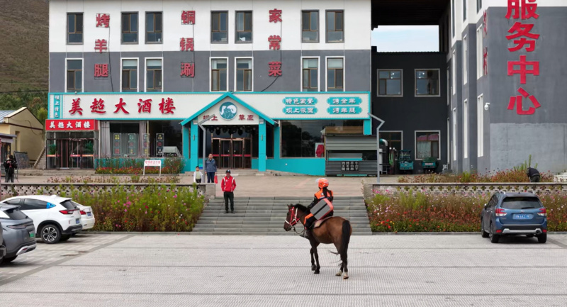 (图:丰宁大滩镇“美超大酒楼”的老板谭美超兼职骑马送外卖,兴趣爱好和赚钱两不耽误。)