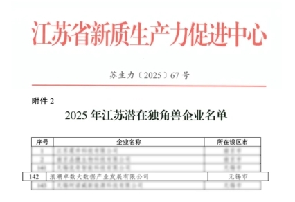 近日,江苏省新质生产力促进中心发布2025年江苏独角兽企业和瞪羚企业评估结果。浪潮卓数大数据入选“潜在独角兽企业”名单。