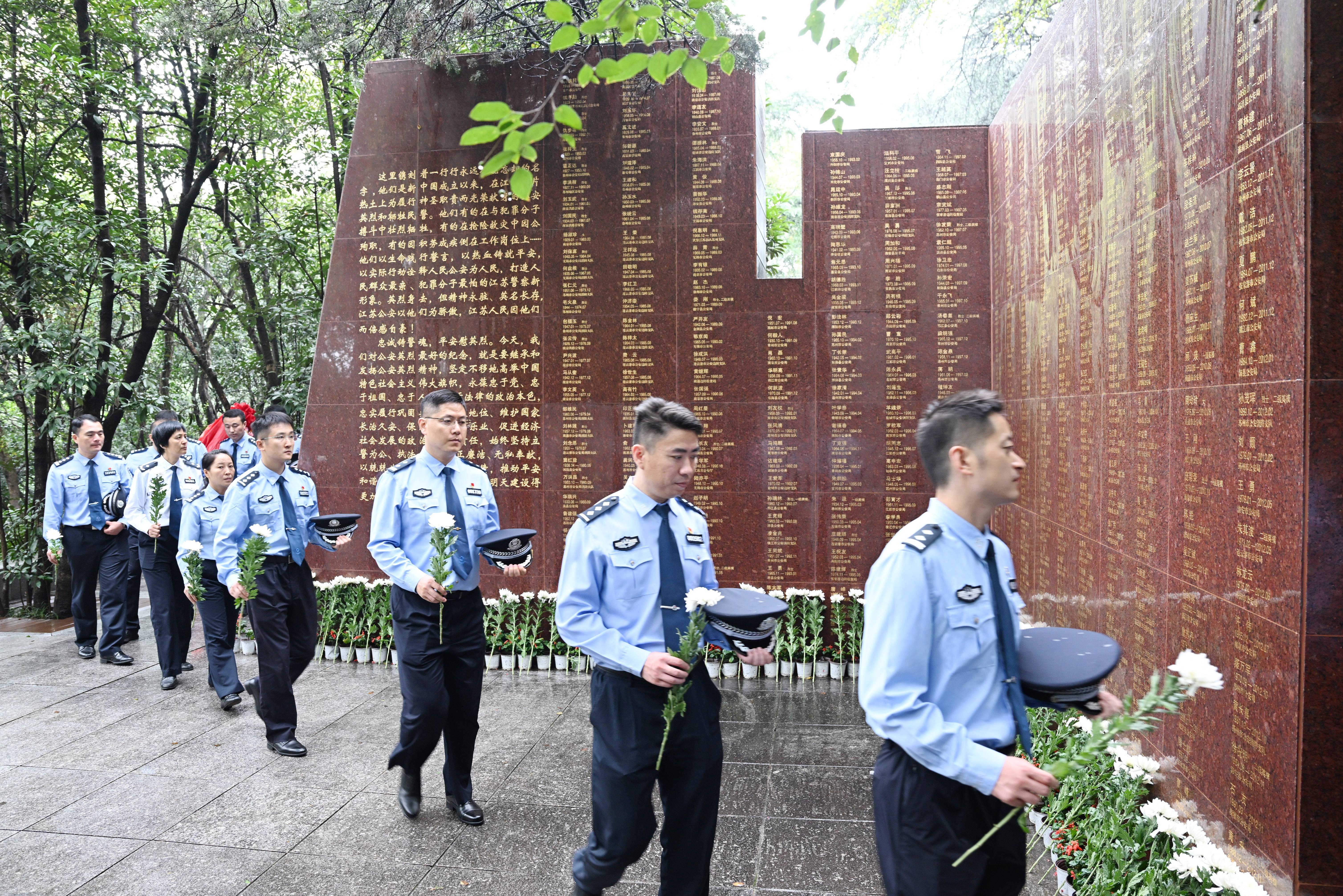 雨后的南京雨花台烈士陵园,空气格外清新,苍松翠柏环绕中,江苏公安英烈纪念墙岿然屹立。上午9时许,在宁省公安厅党委成员,特勤局和江苏警官学院党委成员,厅机关厅级干部、各部门单位主要负责人,以及民警、辅警、学警代表共百余人,在英烈墙前排成整齐的方阵,庄严肃立,齐唱国歌。国歌唱毕,全体人员脱帽致礼,向公安英烈默哀。2名仪仗队员正步向前,向英烈墙敬献花篮。全体民警重温公安机关人民警察誓词。誓言铿锵,丹心闪耀。