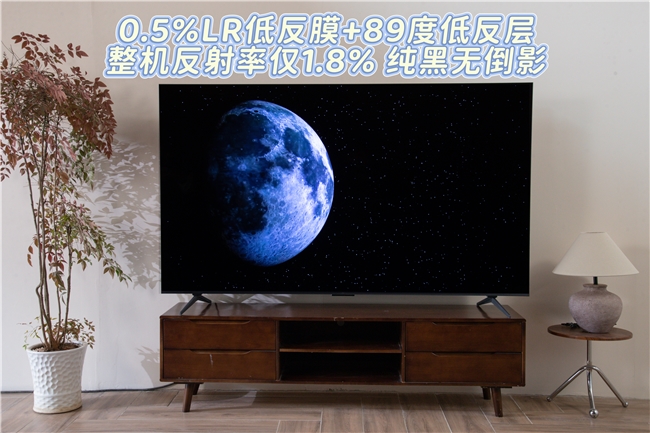 解决反光难题,是T7L Ultra给用户的第一个惊喜。很多品牌为了压低成本,在旗下产品上用的是普通磨砂屏(AGLR方案),虽然能稍微减少反光,但反射率还高达2.6%,同时画面总像蒙着一层雾,细节丢失严重。而T7L Ultra直接用上了内外双低反的蝶翼星曜屏,外层0.5%LR低反膜搭配内层89度液晶分子低反设计,把整机反射率压到了1.8%。这种差距在日常使用中更是明显,比如在光线较强的客厅或晚上开灯的环境中,普通磨砂屏的电视屏幕上会形成明显的光斑和倒影,而T7L Ultra的蝶翼星曜屏能有效削弱光线反射,画面依然清晰通透,能呈现出纯净的色彩和锐利的细节。