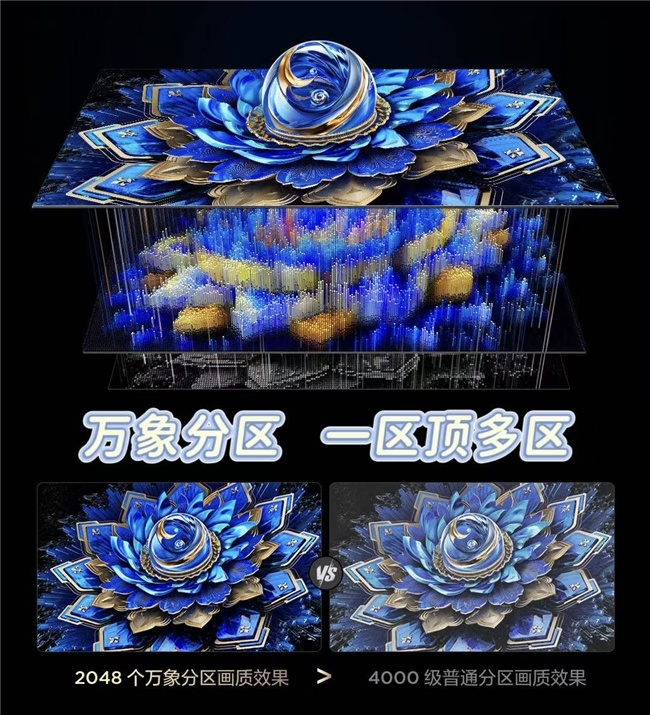 再看Mini LED电视的核心——控光能力。市面上很多同价位的Mini LED电视,只盲目堆积分区数量,却忽略了控光精度。实际上,当分区数增加到一定程度后,对画质的提升效果微乎其微,因此盲目追求高参数性价比不高。而T7L Ultra搭载的万象分区技术,是从底层进行优化,从背光到成像通过对发光芯片、透镜技术、OD设计等7大环节的系统性优化,实现对每一个分区的精准控制,达到“一区顶多区”的控光效果。以98吋的T7L Ultra为例,它搭载了2048个万象分区,画质效果却可以远胜拥有4000级普通分区的电视。