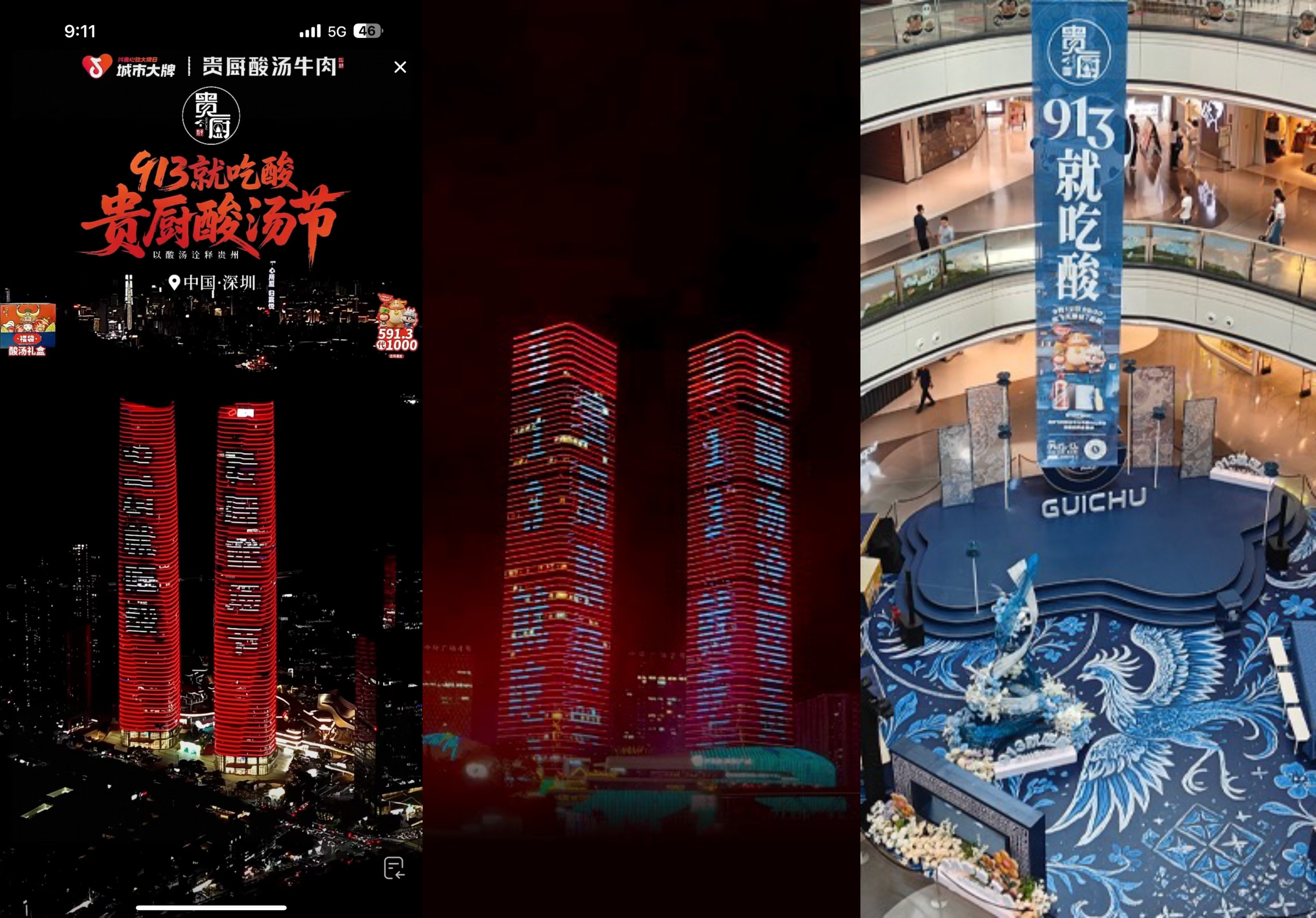 为了将这份源自贵州的舌尖酸香惊喜更全面地呈现给全国观众,贵厨在线下同步启动全域传播。贵阳与深圳的双子塔地标灯光秀,让“贵厨酸汤节”的品牌形象在城市夜空璀璨绽放,成为引人瞩目的焦点;贵州北站等重点交通枢纽的广告覆盖,精准触达商旅人群;城市公交线路、高端写字楼及大型商圈的密集投放,则深入消费者日常生活动线,实现高频次、多场景的品牌曝光。
