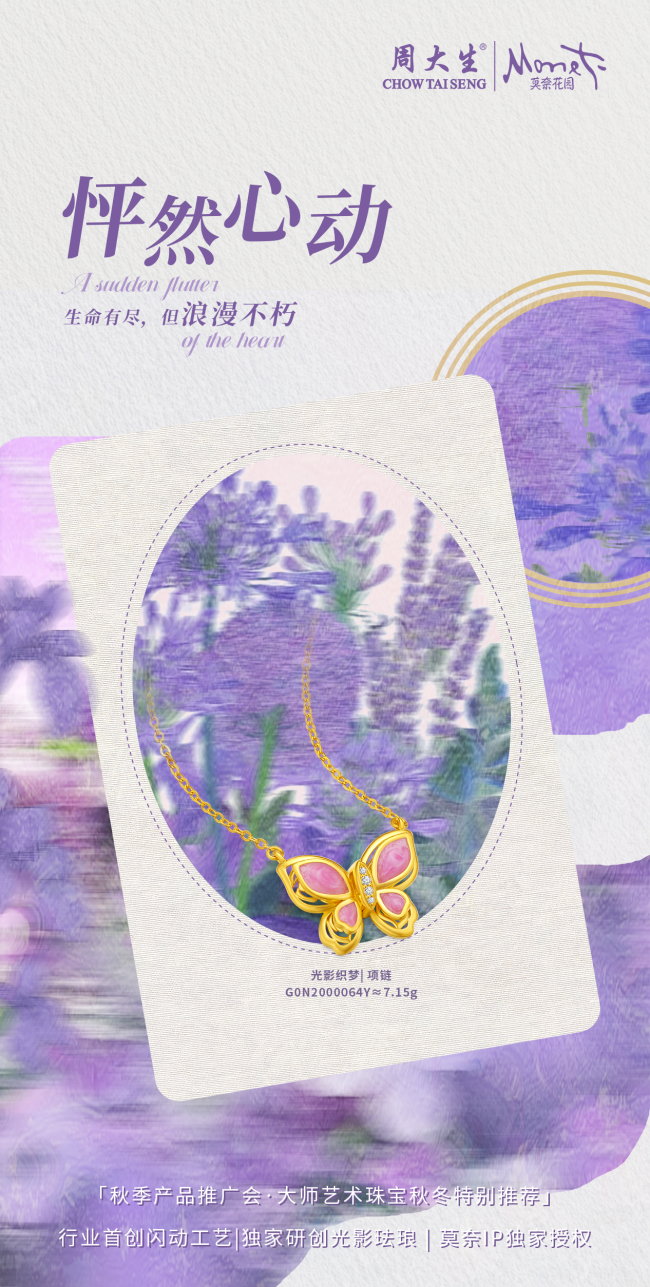 莫奈系列“光影织梦”,从莫奈画作中转瞬即逝的光影汲取设计灵感。周大生大师艺术珠宝从花园飞舞的蝴蝶上,撷取灵动的元素,研创出独家光影珐琅工艺。在日光的映照下,“光影织梦”悄然变幻色彩,恰似莫奈笔下那流动而迷人的光影世界。爱,是蝶翅轻扇的0.1秒悸动,是蝶翼上流转的虹光,是莫奈为心跳调制的那一抹浪漫滤镜。“光影织梦”不仅是对爱的深情诠释,更是将这份浪漫凝固于时光之中。