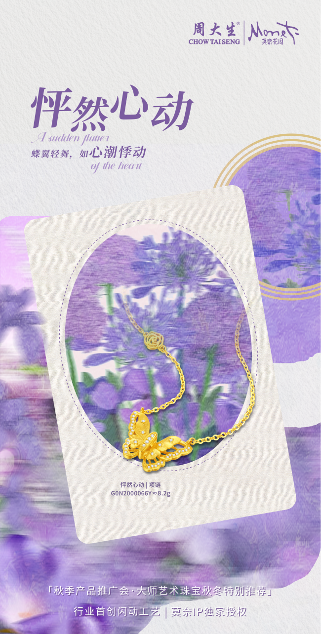 周大生大师艺术珠宝·莫奈系列“怦然心动”,设计灵感源自吉维尼花园中轻盈飞舞的蝴蝶。那微微颤动的蝶翼,仿佛初见时悸动的心跳,轻轻叩击心底最柔软的角落。“怦然心动”不仅是一件珠宝,更是一段穿越时光的唯美爱情故事。蝴蝶,象征着自由与蜕变;而闪动工艺与荧光珐琅工艺的巧妙融合,则赋予了它灵动的生命力。佩戴“怦然心动”之时,蝶翼随步伐轻颤,让爱与浪漫在光影中翩翩起舞,永驻心间。