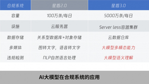 以“星盾系统”为例,由原来的2.0版本升级成为3.0版本,在容量、数据储存、多媒体、设施、违规检测等维度取得突破性进展。从100万条到5000万条的容量跨越,从云服务器到Serverless容器集群的升级,从NLP自然语言处理到大模型语义理解,AI技术的深度赋能正在重新定义金融合规的效率与边界。
