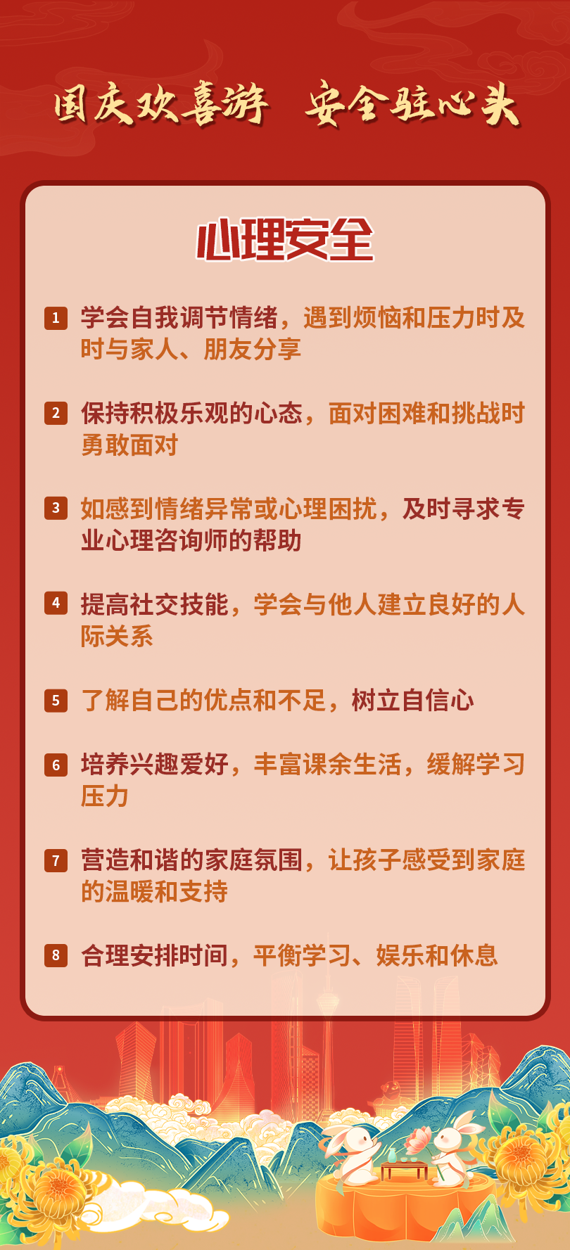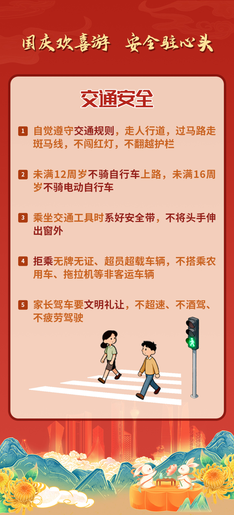 国庆中秋双节假期即将到来,无论您和孩子是在家休息还是外出游玩,安全这根弦绝不能松懈。为了让您和孩子拥有一个安全、快乐、有意义的假期,请务必时刻牢记安全第一,并做好以下安全事项!